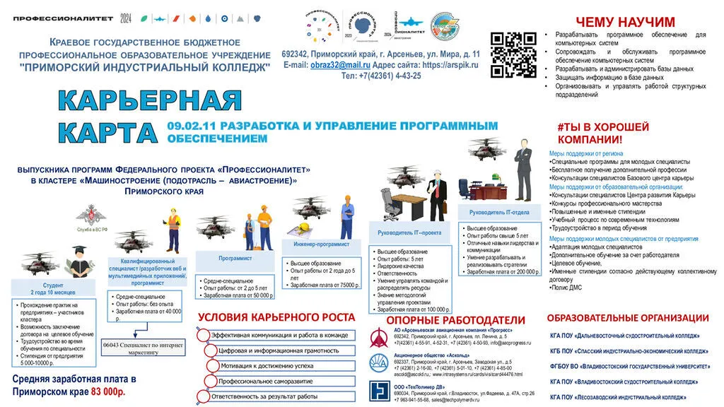 Описание специальности:Специальность относится к области информационно-коммуникационных технологий. Осуществляется подготовка специалистов среднего звена: квалифицированных разработчиков программного обеспечения, проектировщиков и менеджеров проектов, занимающихся созданием, тестированием, внедрением и сопровождением ПО. Выпускники осваивают современные технологии программирования, методы проектирования приложений, управления проектами и команды разработки.